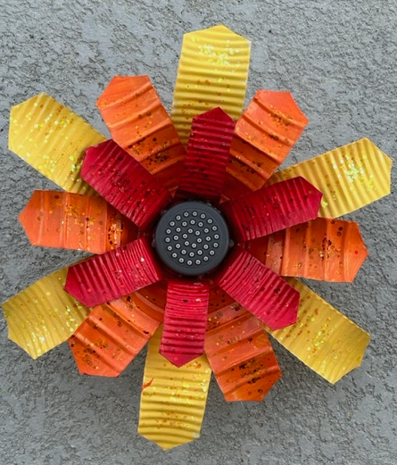 Our flower showers stand 7ft tall. They are made a copper pipe and brass leaves. The flower is made of recycled metal. They are hand painted in bright colors and sealed with a clear finish to protect the paint. There is a valve handle so you can turn it on and off. When you take it home all you have to do is step it in the ground and hook it up to your hose. It will be a great functional conversation piece to add to your yard.